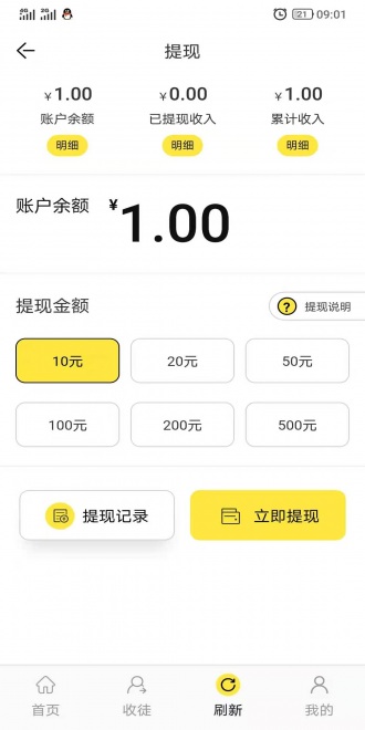 4.收益提现:满10元即可申请提现,24小时内审核到账,方便快捷。