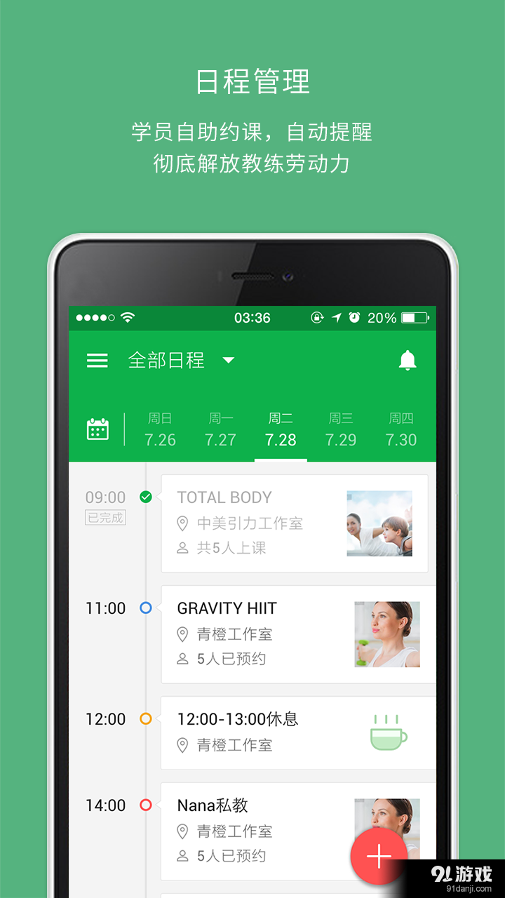 1. 课程安排:教练可以在“我的健身房”中添加团课、私教种类和课程排期,以及批量设置休息时间。