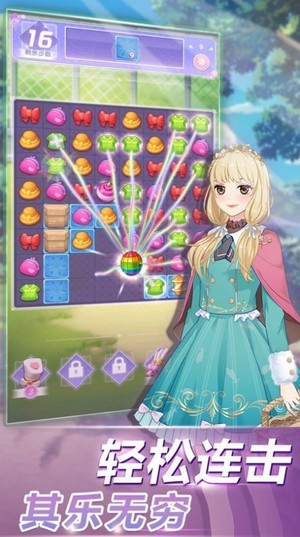 2. 核心玩法:游戏结合了经典的三消玩法与换装元素,玩家需要通过消除关卡来获取服饰配饰,进而自由搭配角色造型。