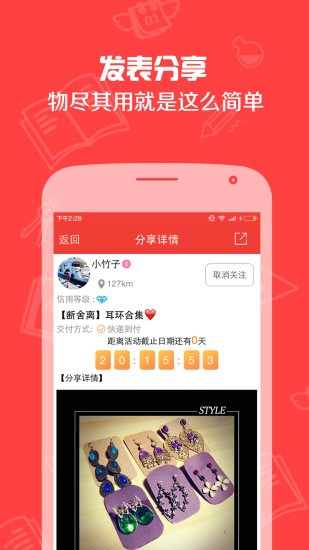2. 分享发布:用户可以发布自己的分享,包括物品照片、文字简介等,方便其他用户了解。