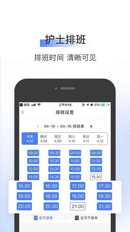 4. 在线接单服务:作为专业医疗机构主导的护士多点执业平台,护士可以在线接单,提供上门护理服务。