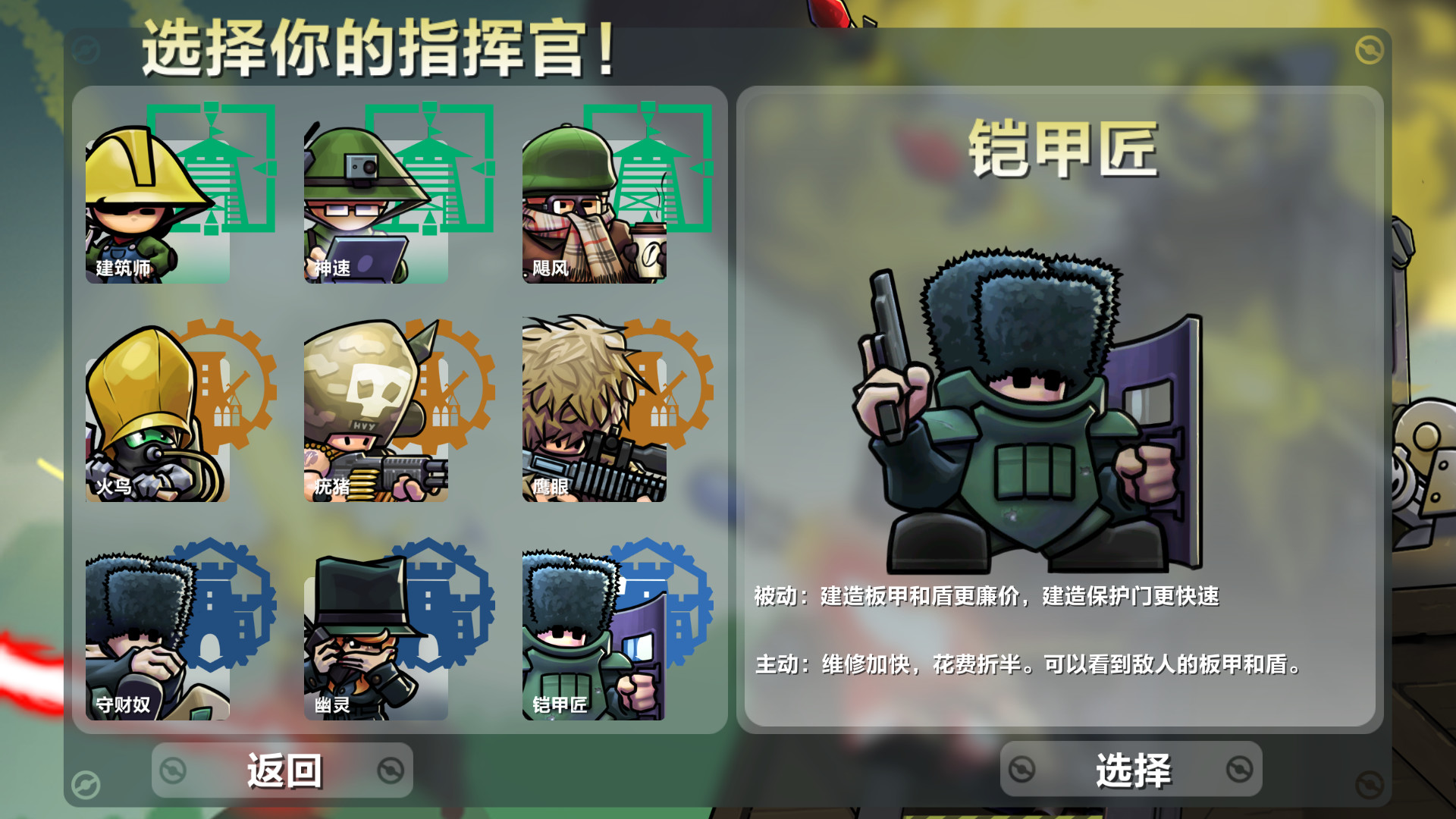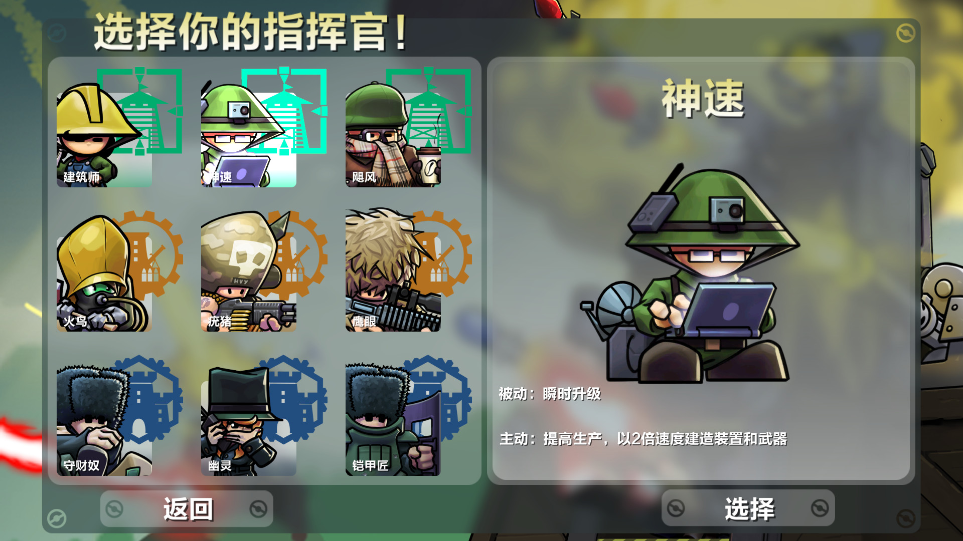 虽然进击!要塞!主要聚焦于要塞的建造与攻防,但游戏中也包含了多种指挥官角色,每位指挥官都拥有独特的主动和被动技能,为游戏增添了策略深度。例如: