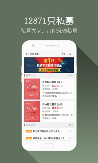 1. 主界面展示热销基金、私募专区等信息,方便用户快速了解市场动态。