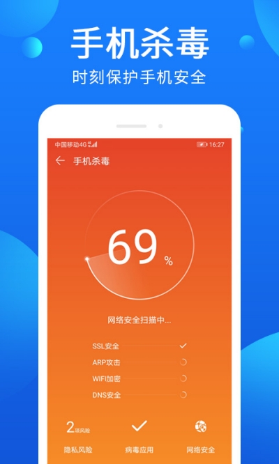 1. 当手机出现卡顿、运行缓慢时,可以使用杀毒清理管家进行一键加速和内存清理,提升手机运行速度。