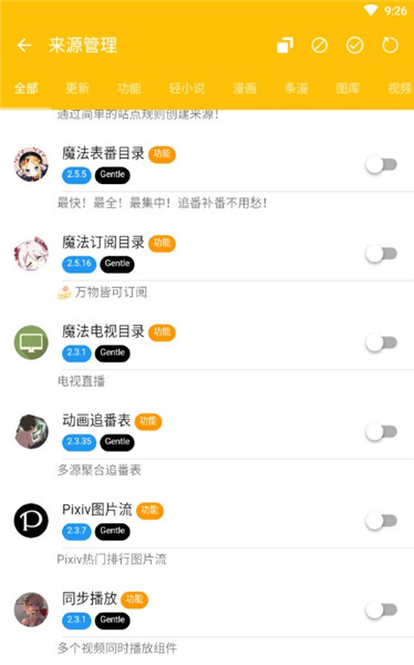 1. 如何添加资源:打开exview,点击上方快捷导航栏的加号,软件会自动加载服务器并按功能分类。用户可以选择漫画、视频、轻小说等分区,然后拨动对应的开关加载资源。