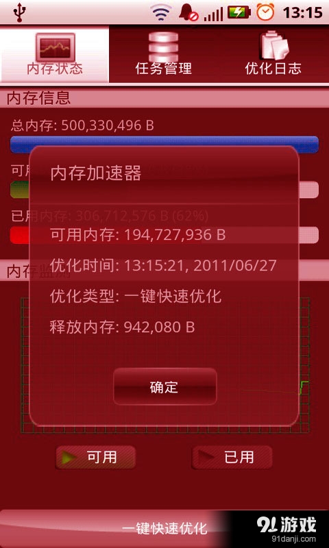 3. 一键优化功能:支持一键快速优化,用户只需点击一下即可清理内存垃圾,释放内存空间。