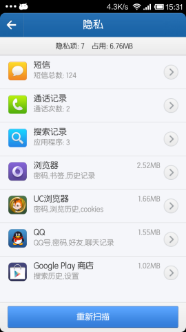 隐私保护:清理浏览器历史、通话记录、短信等隐私信息。