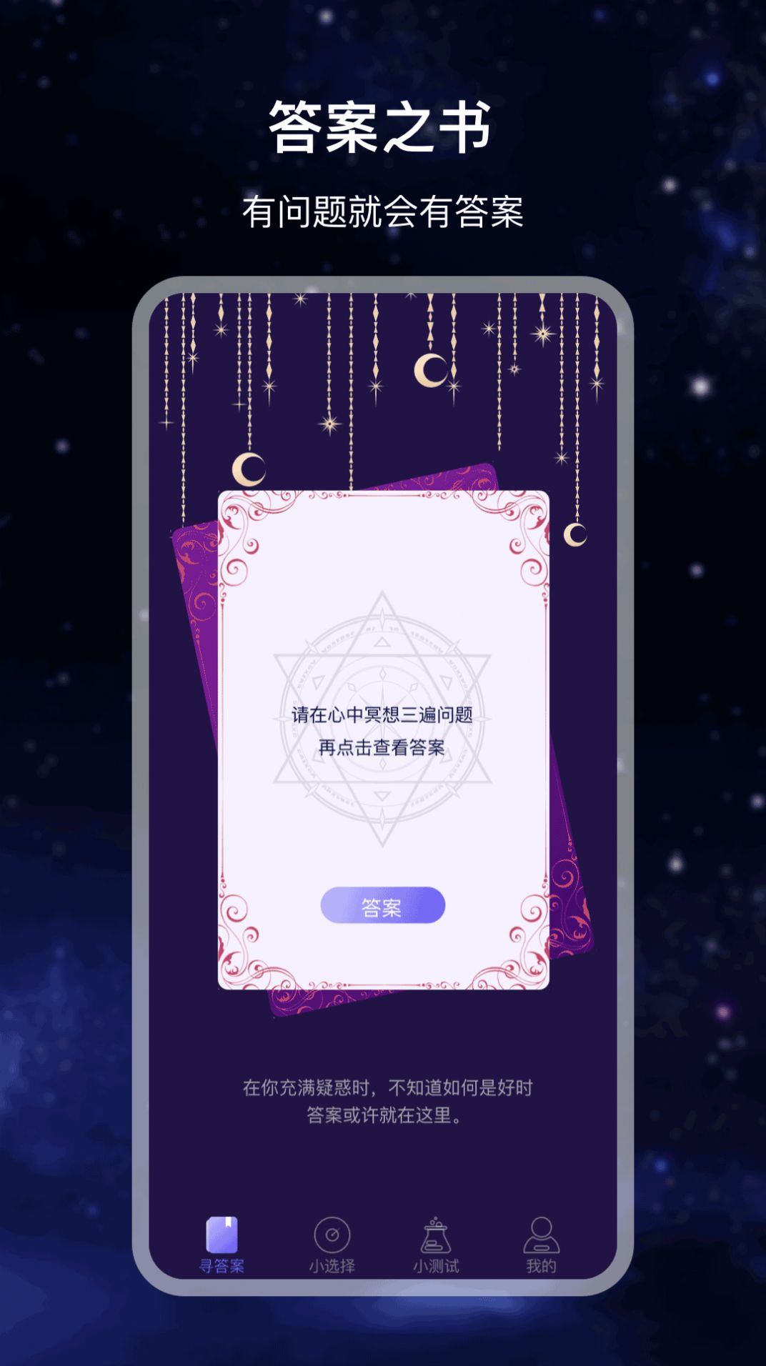 决策答案之书app是一款专为安卓手机用户设计的趣味模拟测试辅助软件。它不仅能帮助用户在面对各种生活决策时提供快速而有趣的答案,还内置了多种有趣的小测试和决策转盘,让用户在使用中体验到更多的乐趣。通过简单的冥想和问题输入,用户就能获得来自“答案之书”的智慧指引,这种设计既富有仪式感,又能激发用户内心的积极态度。