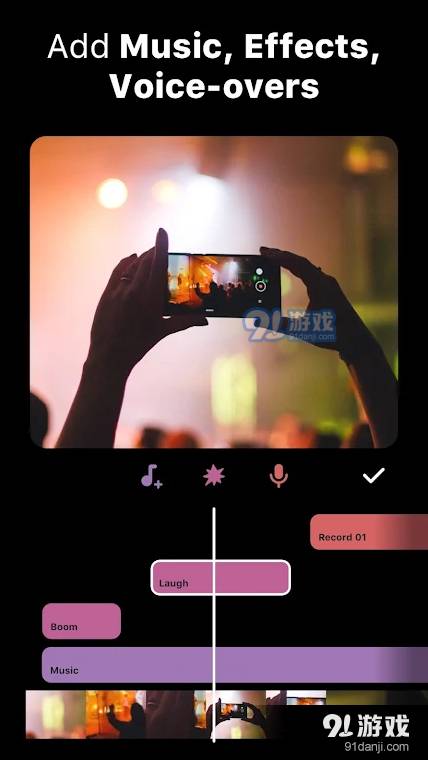 3. 添加音乐:提供精选免费音乐,支持用户自定义音乐,同时可以设置音量、淡入/淡出效果。