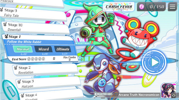 3. 角色系统:游戏初始提供8位角色,每位角色拥有独特技能与属性加成,例如“红龙怒息”可扩大音符判定范围,“时间缓滞”可延长Fever Mode持续时间,角色技能与关卡特性需策略搭配。