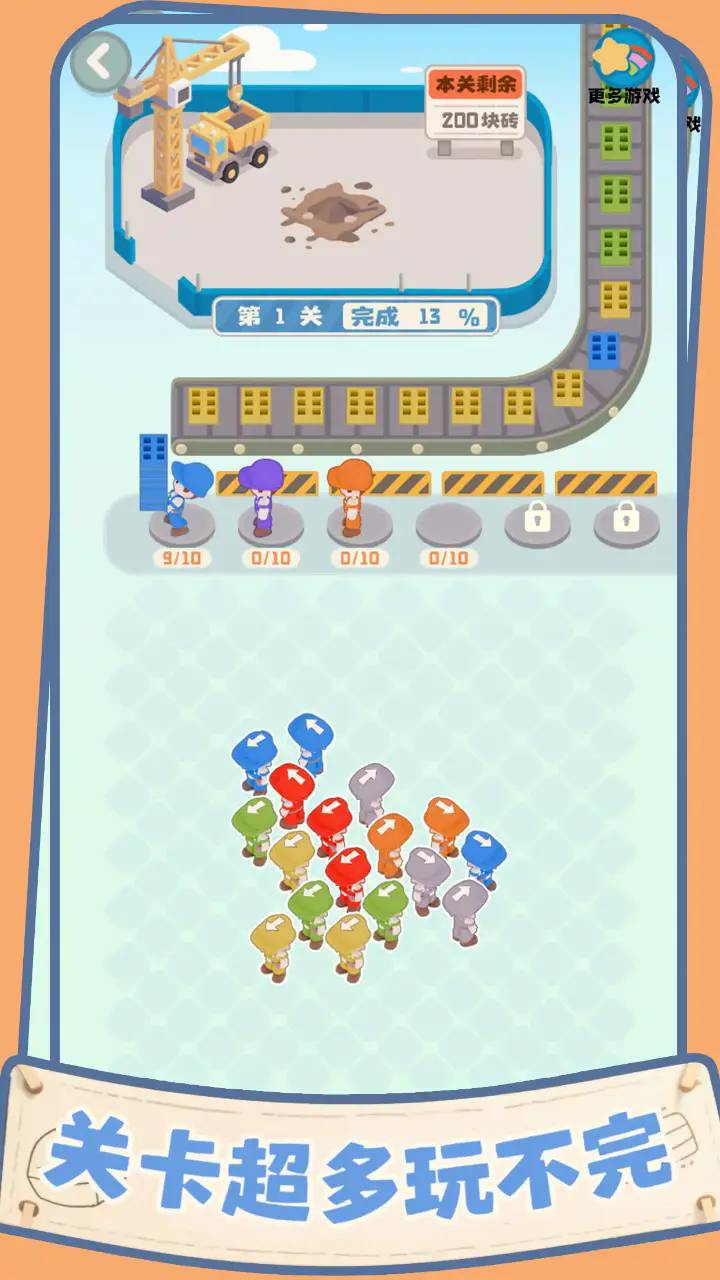 1. 核心玩法:玩家需根据砖块颜色匹配对应工人,指挥他们沿固定路线搬运材料至指定区域。每关设定明确的砖块数量与颜色目标,需合理分配工人任务,避免闲置或搬运错误。