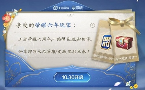 2、并且玩家在10月30日登录游戏,即可在活动界面的周年庆活动中领取66-666随机不等的点卷返利,并且还有永久的皮肤和英雄等着玩家领取。