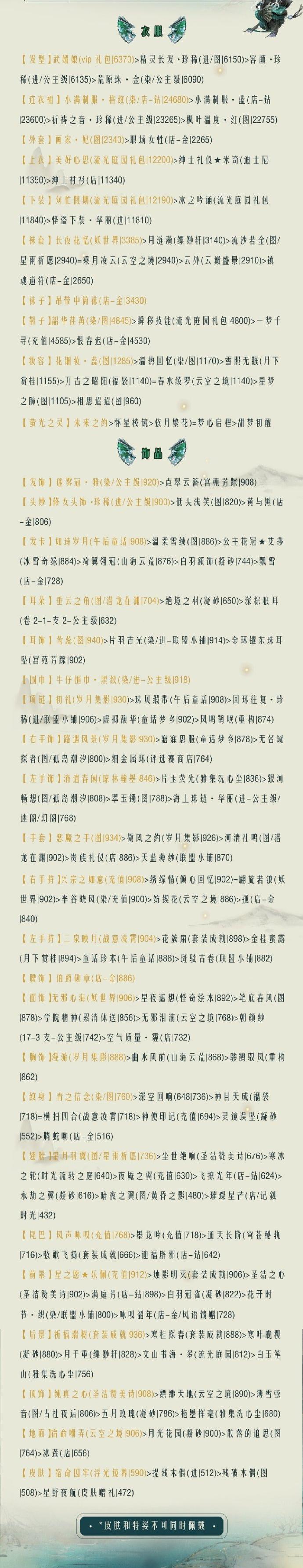 3、袜套:长夜花忆,袜子:吊带中筒袜,鞋子:韶华荏苒,妆容:花钿妆蕊,萤光:未来之约,头饰:迷雾冠雅,头纱:修女头饰珍稀,发卡:如诗岁月,耳朵:垂耳之角,耳饰:莺蕊,围巾:牛仔围巾黑纹,项链:初礼