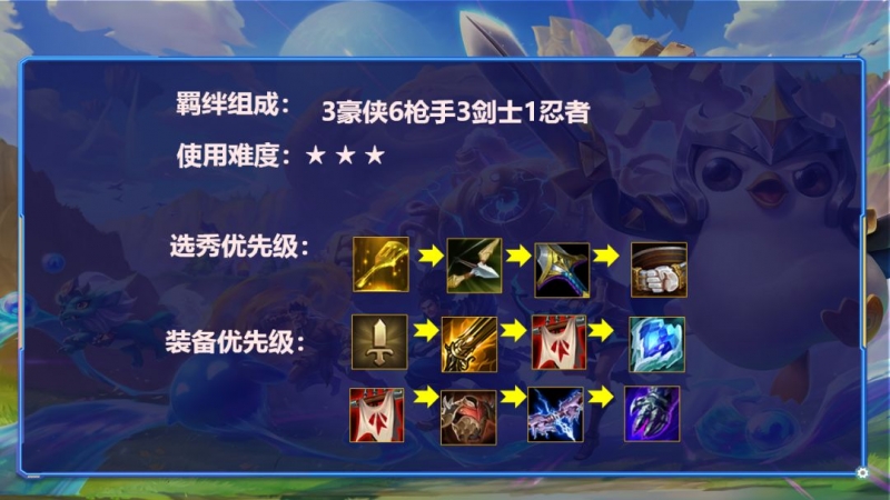 核心运营节奏: 需要3个攻速+铲子不过现在3局有2局都会有铲子的,1-1选秀如果看到有铲子优先铲子,攻速可以后面卖血拿,优先剑转其次火炮,第三件可以等4-2特殊装备,男枪有了剑转+火炮+三星这把分就到手了。