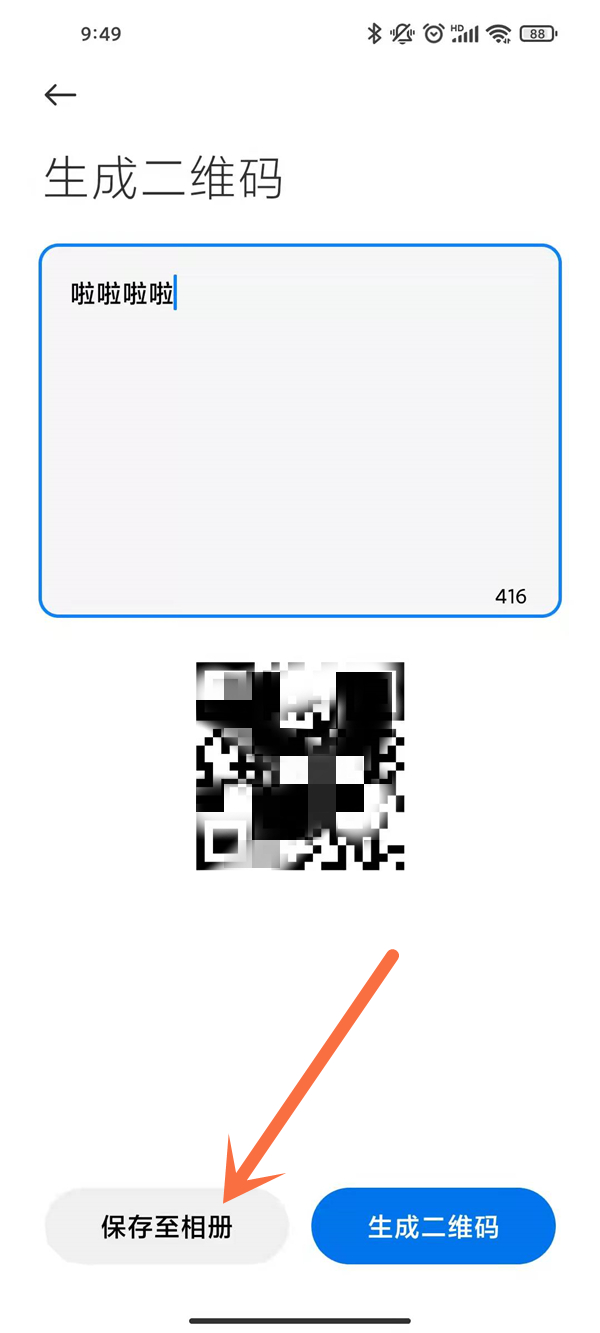 4、输入生成二维码的内容,然后选择生成二维码,再点击保存到相册即可,用时在相册调出二维码就能使用。
