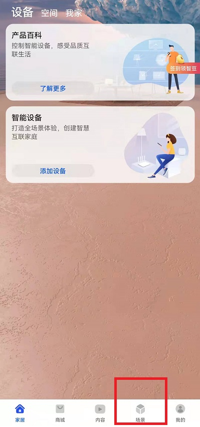 1、首先我们需要打开【智慧生活】软件,进入到软件之中,在软件界面中点击右下角的【场景】进入到场景界面中;