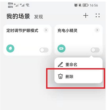 3、在我的场景中,长按【充电小精灵】在弹出的选项中,点击删除,只有删除此服务才能取消。
