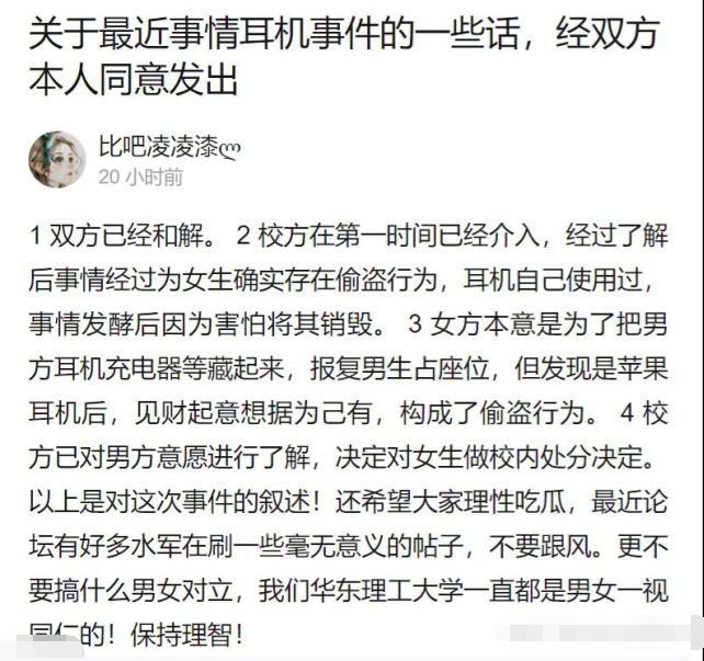该事件扩大后,学校对此的处理是记女生处分,但对于女生的宽容(女生还保研了)惹怒了一群人,因为之前有男生偷窃直接是被开除了,所以这个问题上升到了男女对立话题,网友纷纷开始嘲讽华理的双标行为。