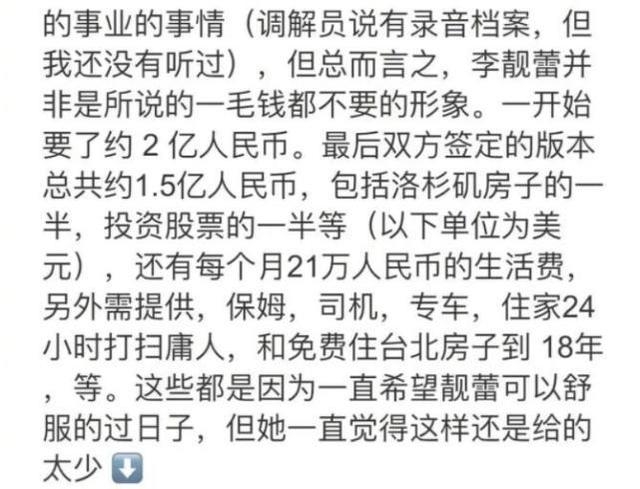 王力宏的发文总结一句话就是钱没给到位还遭前妻造谣 ,李靓蕾文中是生活点滴,因爱生恨的全过程,换句话来讲,王力宏还是希望把过错都推给别人,而李靓蕾不停的实锤爆料,王力宏已经完败。