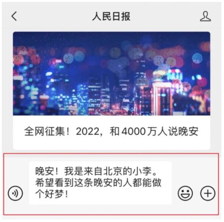 你发送的晚安内容将有机会登上人民日报微信,我们将在2022年的第一个月,以短信等多种形式发送给人民日报微信的读者朋友。
