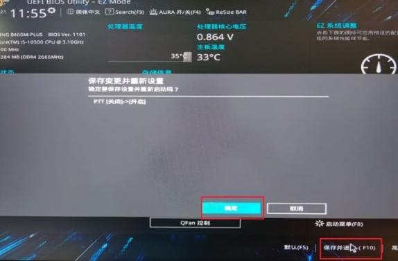 5.在出现的ptt选项中,我们点击【确定】。将该功能开启,就能够启用【tpm2.0】啦。
