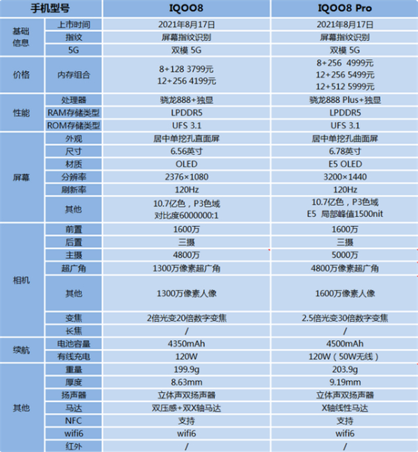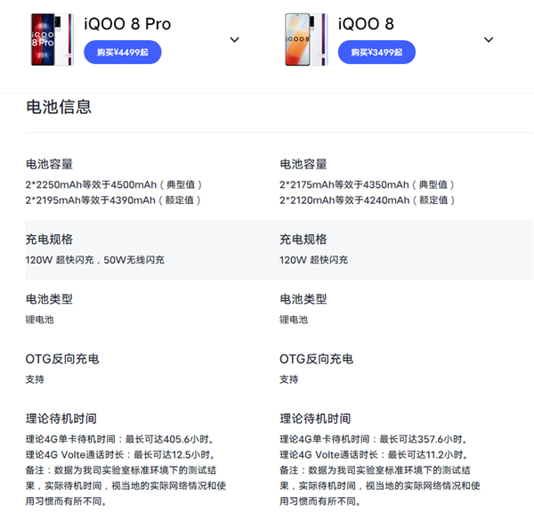 IQOO8采用了120W的超级闪充,电池容量4350mAh,可以快速充满电池。而IQOO8 Pro则是在120W有线闪充的基础上新增了50W的无线充电,电池容量也提升到了4500mAh。