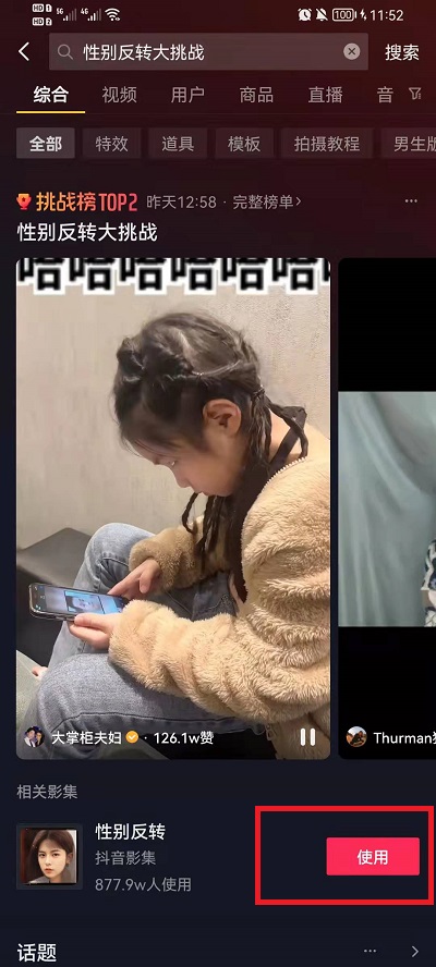 2、在搜索界面中,输入【性别反转大挑战】点击搜索,就可以找到该视频模板;