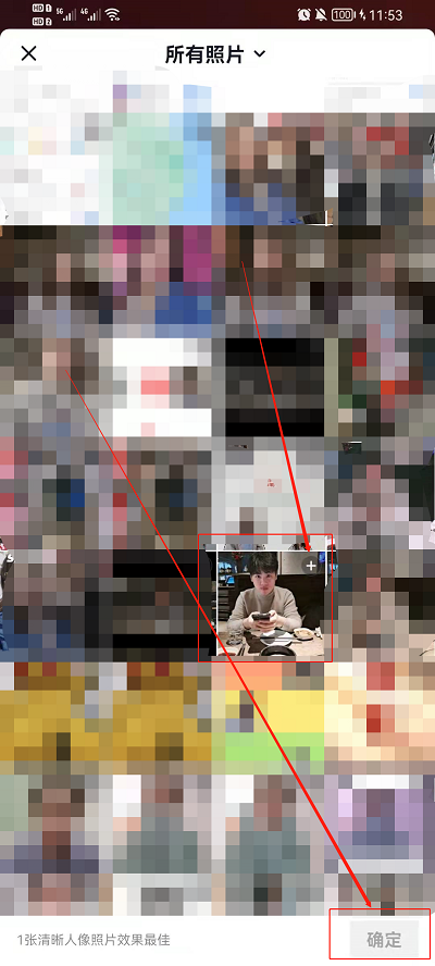 4、点击使用后会跳出来我们的手机相册,只需要选择一张我们正脸的手机照片,然后点击右下角的【确定】就可以进行生成变换,不需要进行拍摄,就可以等待效果生成;