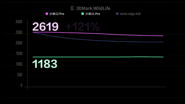 在全程高压的调度下,测试结束后小米12 Pro最高温出现在边框处,为47.2度,同时分数最高2619,相比上代888提升了121%。这个分数与上一款骁龙8的2610分在同一水平,但发热直接下降10度,可以说小米12 Pro用更低的温度,获得了同样的性能,散热表现不错。
