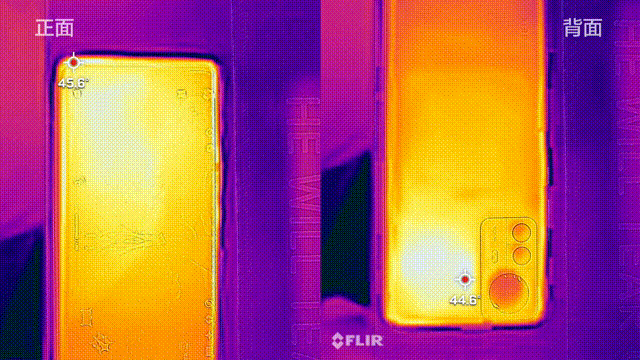 游戏结束后我们也马上用外红测温仪实测了一下半小时过后的温度,发热主要集中在左手边框的位置, 正面最高温度45.6度,背面最高温度44.6度。