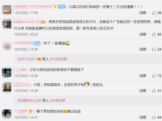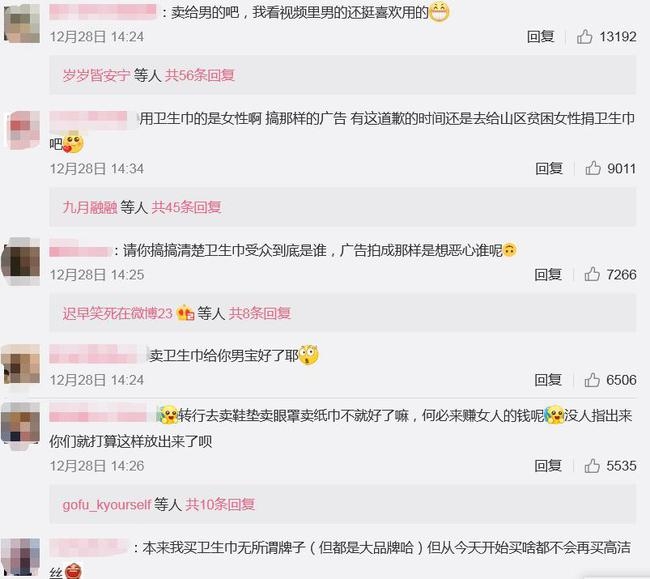 有网友直言,“请你搞搞清楚卫生巾受众到底是谁,广告拍成那样是想恶心谁呢?”“用卫生巾的是女性,搞那样的广告,有这道歉的时间还是去给山区贫困女性捐卫生巾吧。”