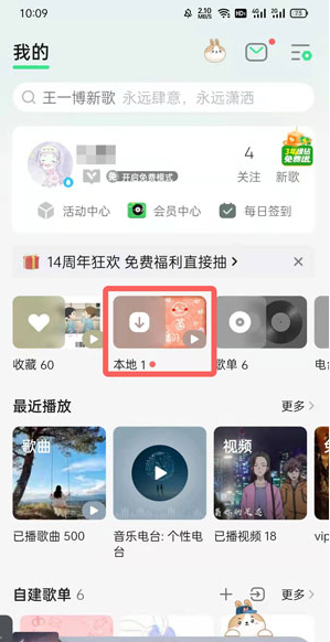 1、打开手机QQ音乐“我的”页面,点击“本地”;