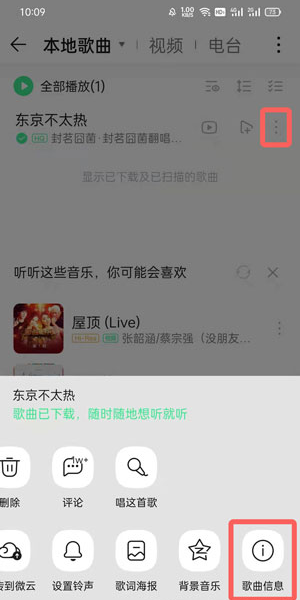 2、在下载的列表中选择自己需要查看存储位置的歌曲,点击右侧的三个点,然后选择“歌曲信息”;