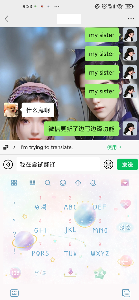 这次微信安卓版推出的边写边译功能和ios版本的使用方法是一样的,向微信好友连续发送三次英文短语或句子即可,例如小编此次发送的是“my sister”然后微信就会提示:长按输入框可以开启「边写边译」,点击即可。