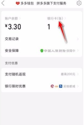 3.然后就会进入到多多钱包页面,我们在页面上方找到“银行卡”选项,点击它即可进入到银行卡页面。