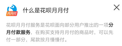 总结:花呗月月付是花呗面向部分用户推出的一项“分月付款服务”,在购买支持月月付的商品时,可以先付一部分,尾款按月慢慢付。但是因为周期更长,预计商家会涨价,建大家在购买之前货比三家。