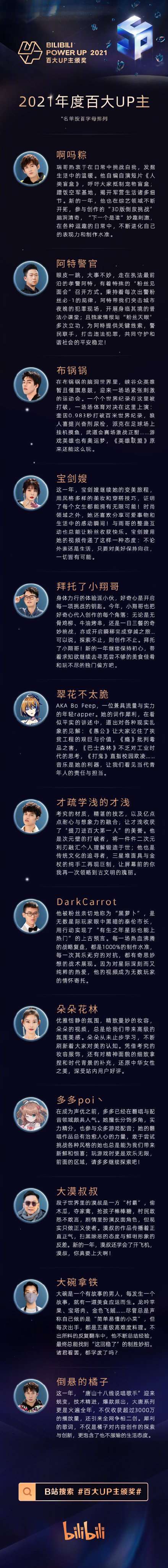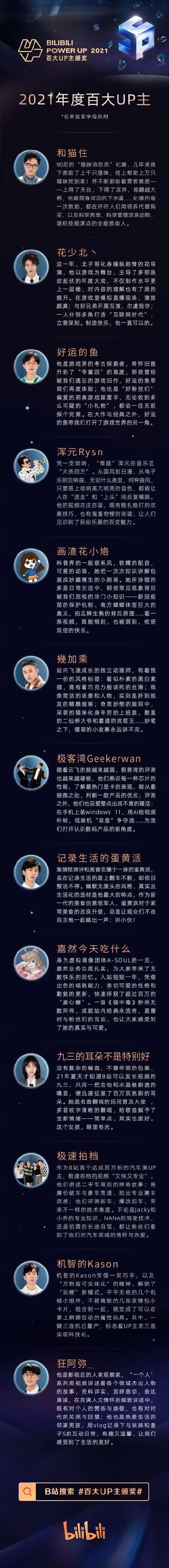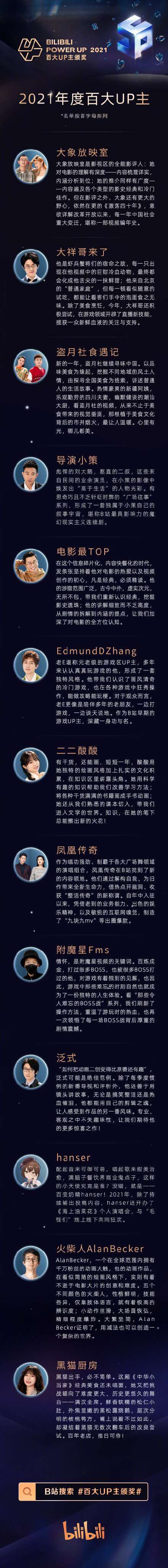 据介绍,2021年度百大UP主是经官方从「专业性、影响力、创新性」等维度综合评定后,在2021年名列前茅的100位UP主。