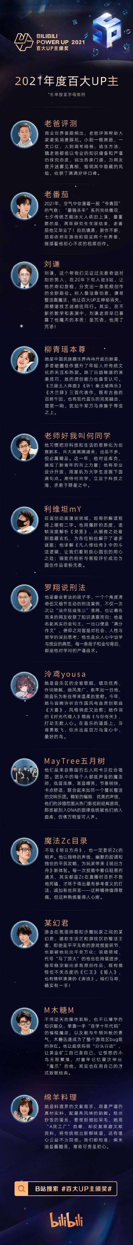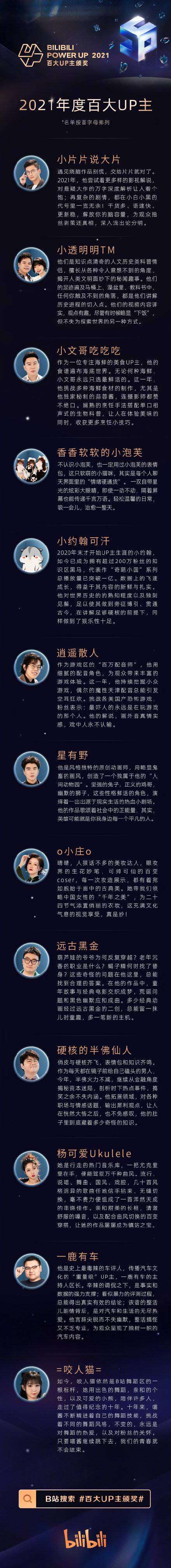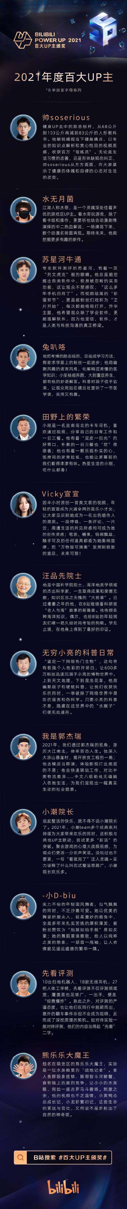 据介绍,2021年度百大UP主是经官方从「专业性、影响力、创新性」等维度综合评定后,在2021年名列前茅的100位UP主。