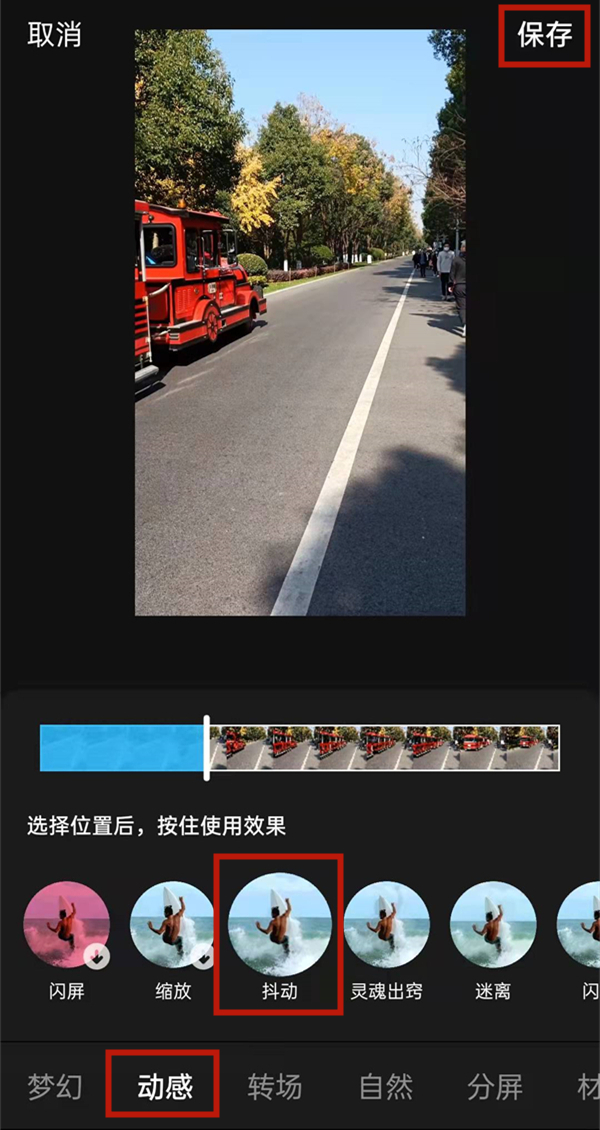 4、在动感里面选择抖动特效后,添加到需要设置的时间,选择保存即可。