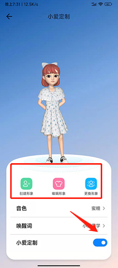 3、在定制形象的界面中,我们需要打开最下方的【小爱定制】功能按钮,然后点击上方的【创建形象】【编辑形象】【更换形象】就可以进行定制;