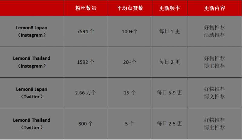 而且对于用户而言,视频创作难度大于图文创作难度,且一个普通用户很难在抖音或 TikTok 上获得出头之日,但很有可能在小红书上日吸千粉。所以字节要做的不是用「Lemon8」去抢占 TikTok 的用户和客户,而是希望借「Lemon8」去覆盖原来 TikTok 难以覆盖到或者长期留存和激励创作的用户,从而进一步满足客户/品牌主在不同阶段和不同时期的多样化需求。因而对于「Lemon8」当务之急要做的是,在小红书之前找到对素人种草更有信任感的市场和用户。从结果来看,「Lemon8」认为日本市场和泰国市场可能是好的标的。