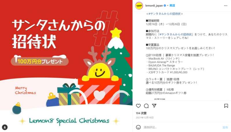 「Lemon8」在站内站外做了不少活动,鼓励用户们下载、使用并在「Lemon8」上发布内容,胜出的用户除了可以获得官方推荐还可以获得包括但不限于苹果电脑、戴森吹风机、亚马逊礼品卡、大牌礼物等众多奖品,属实有不错吸引力。