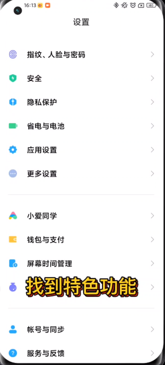 1、首先需要打开手机,然后在手机中找到设置,然后在设置功能中打开【特色功能】进入其中;