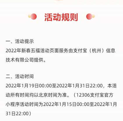 活动时间:2022年春节集五福活动将于1月22日左右开始,不过大家可以提前收集福卡。
