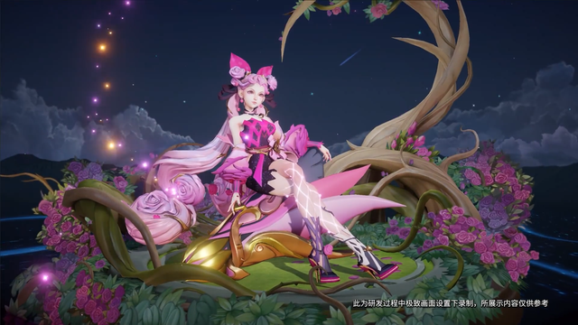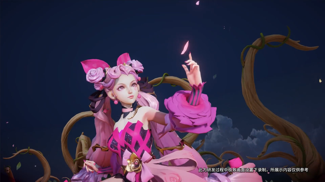 基于粉蔷薇的主题,将技能子弹包装为了蔷薇花朵,展现了蔷薇花绽放的过程和形态。