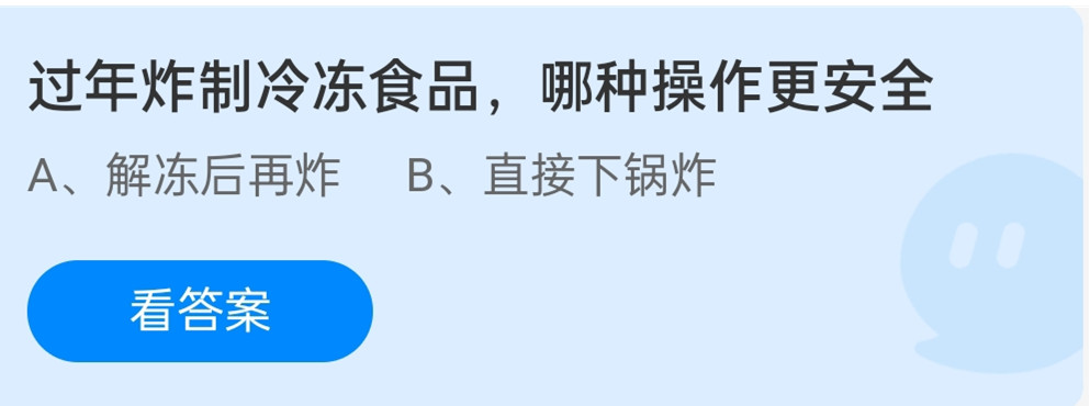 在蚂蚁庄园小课堂1月20日的问答中其中的一个问题是:过年炸制冷冻食品,哪种操作更安全?很多的小伙伴还不知道正确的答案,今天去秀的小编就给大家带来了详细的介绍,有需要的小伙伴就一起来看看吧!