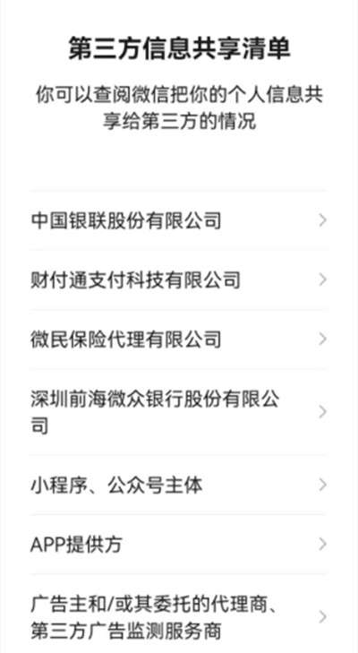 此外,在“我-设置”中,新增了“个人信息与权限”、“个人信息收集清单”、“第三方信息共享名单”。值得一提的是,“第三方信息共享名单”可以查询到微信将个人信息共享给第三方的情况。