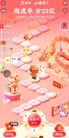 打开快手APP点击左上角【三】-【迎虎年分22亿】或点击顶部【春节】进入活动