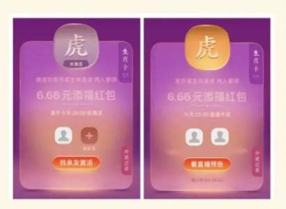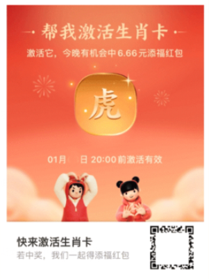 通过生肖卡玩法得到的红包是添福红包。添福红包是五福集齐开奖后,在大年夜的五福红包之外的红包奖励。需要注意的是,集齐并合成五福,是添福红包最终发放到帐的前提哟。获得生肖卡后,你需要在当天20:00前邀请一个亲友激活生肖卡。当生肖卡被激活后,你和亲友都可以参与当天的开奖。如果中奖,你和亲友都可以得6.66元添福红包!