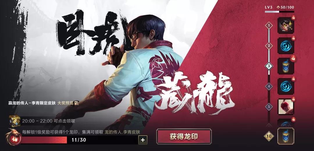 其中,1月26日上午10点开启“卧虎藏龙 新春挑战”活动,召唤师们可以通过完成任务,免费获得经典皮肤“龙的传人 李青”。